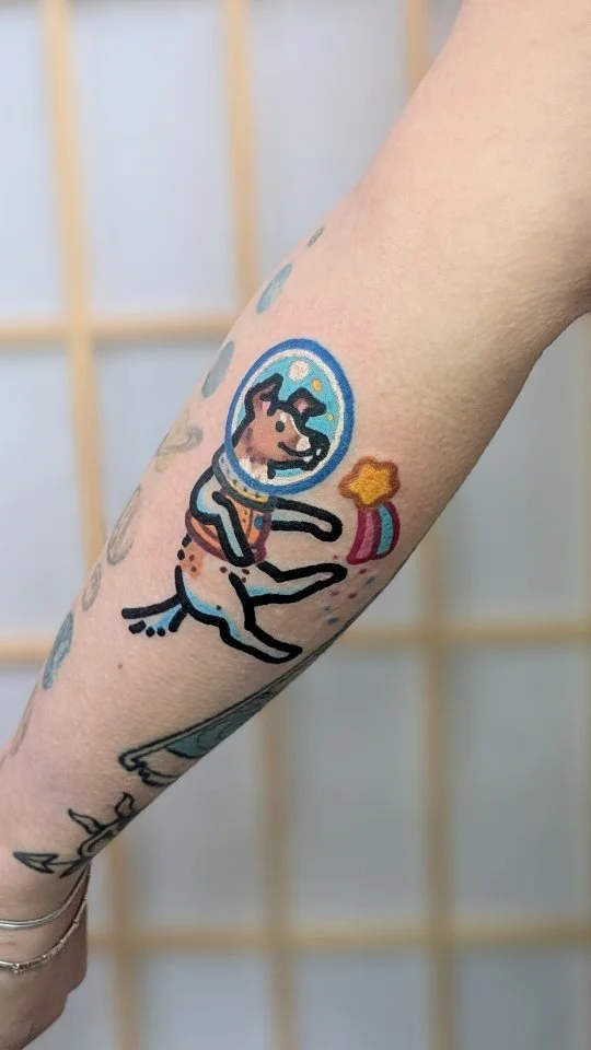 My tattoo style is bold and colourful. I love everything cute. My favourite thing to tattoo is animals, particularly obscure ones…but I’m happy to tattoo anything as long as I can make it colourful and fun!